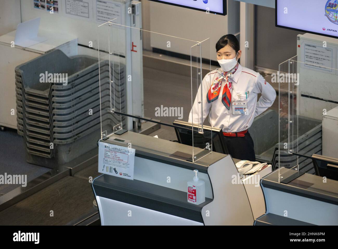 Tokyo Japan 17th Feb 2022 Japan Airlines Jal Staff Is Waiting At The Check In Counter Of The International Terminal At Haneda Airport For Passengers Japan S Prime Minister Fumio Kishida Announced At His Press